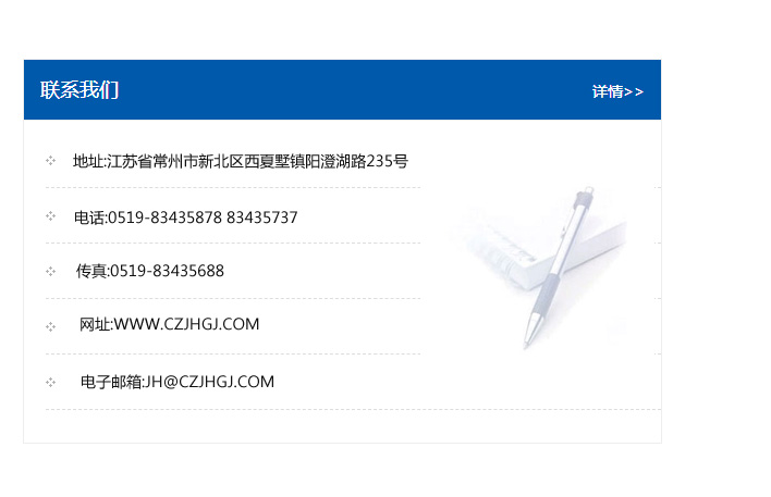 地址:常州市新北區(qū)友邦商務大廈1幢16、17層  電話:0519-85101652  傳真:0519-85112595  郵編:213022  網(wǎng)址:www_cz-jiayue_cn.haomei-life.com  郵箱:xiajifengaa@163.com